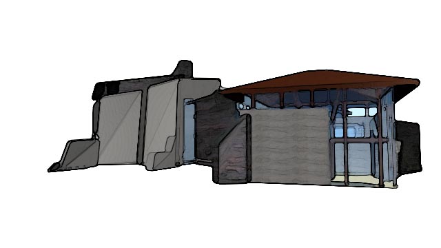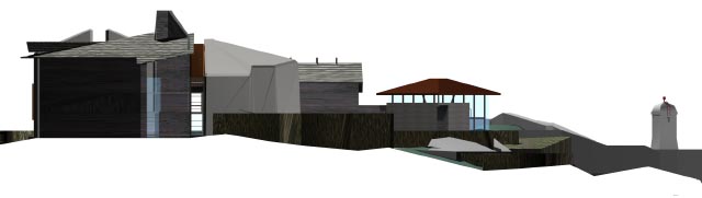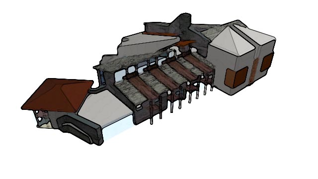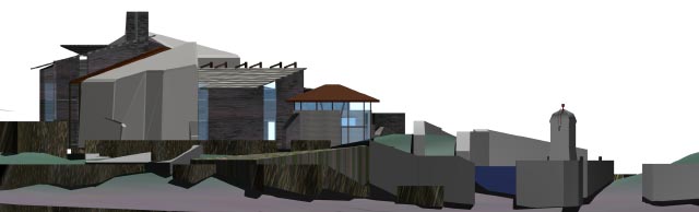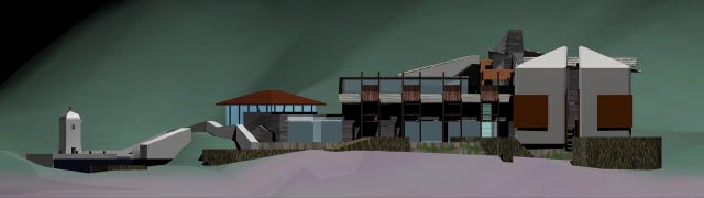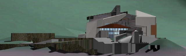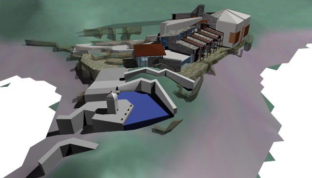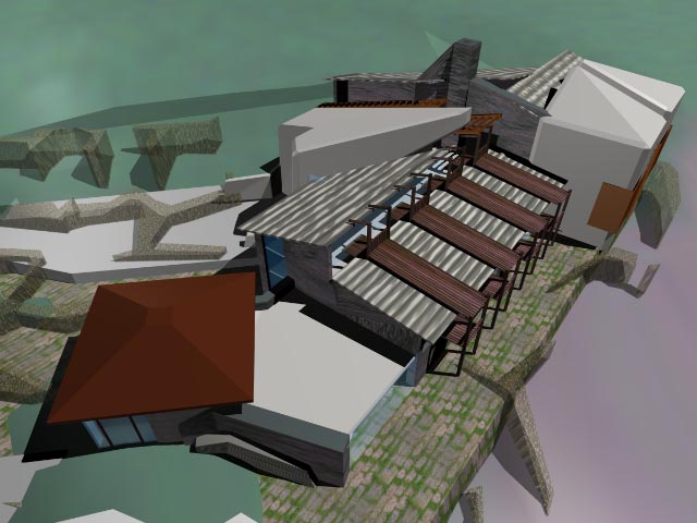 Hotel on the Adriatic coast This is design proposal for small hotel / pension on the Adriatic coast. It has sixteen guest rooms, six of them hi-class apartments. It is located on small peninsula which is part of a bigger bay. Main goal here was to use local materials and traditional techniques when building facades of this architectural object. Standard 3d rendered look wasn't appropriate to communicate this concept graphically. That's why I used Fractal Painter and Photoshop filters to soften 3d rendered images and achieve painterly effect.